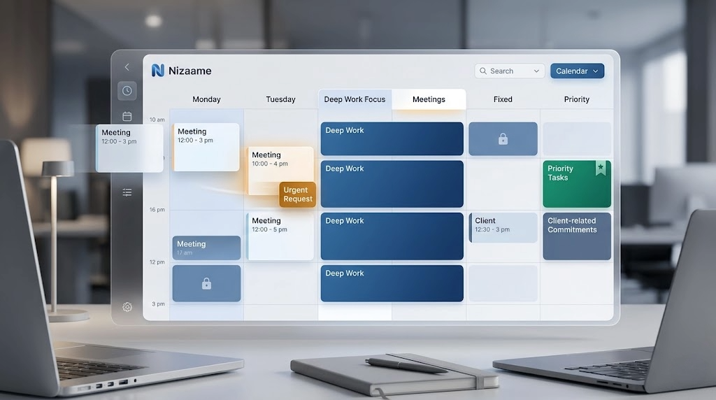 C'est là qu'un outil comme Nizaame devient pertinent, non comme gadget de productivité, mais comme couche d'orchestration. L'enjeu n'est pas seulement de déplacer des blocs dans un calendrier. L'enjeu est de replanifier les tâches importantes sur des créneaux plus pertinents, sans perdre la logique globale de la semaine ni sacrifier systématiquement le travail de fond.