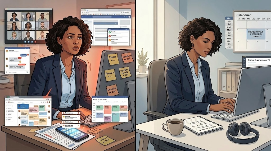 Le résultat est familier : agenda subi, impression de dispersion, sensation d'avoir "beaucoup fait" sans avancer sur les livrables critiques, puis culpabilité quand vous devez produire le plus exigeant dans le pire créneau possible.